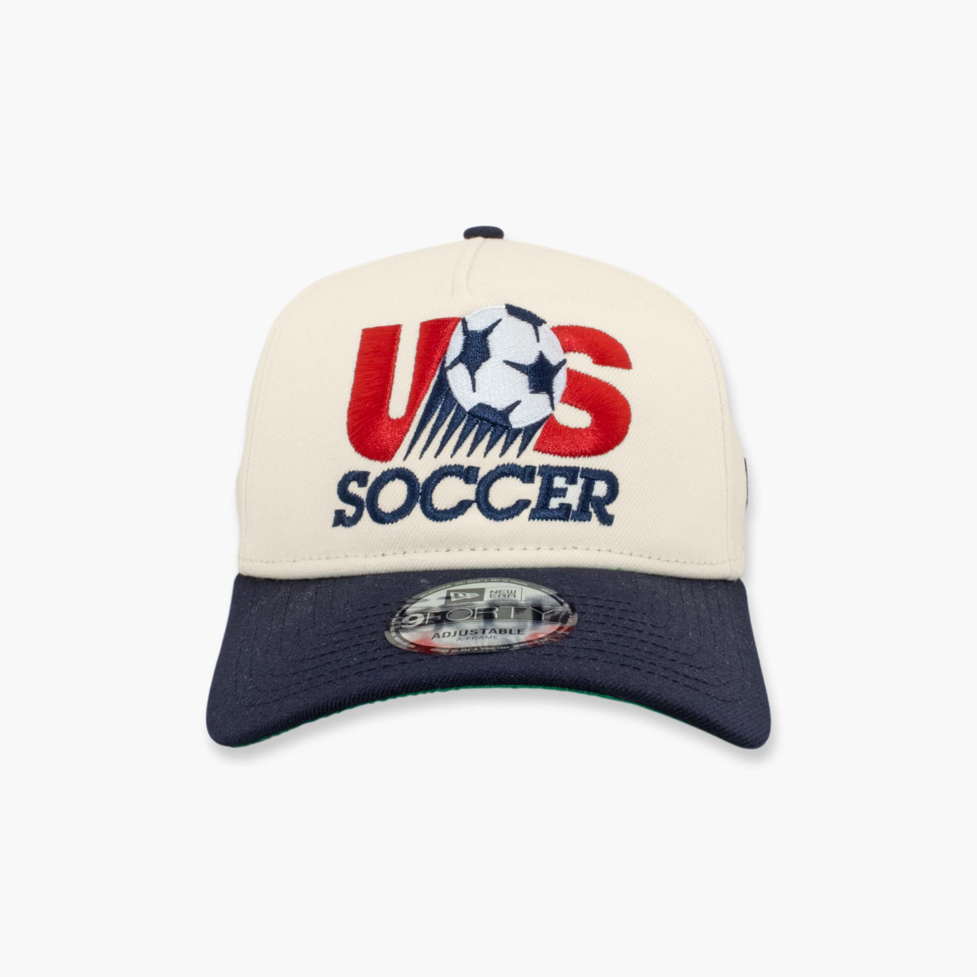 The US Soccer Retro Two-Tone A-Frame Snapback brings vintage national team style to a modern silhouette. Featuring bold retro embroidery with a classic soccer ball graphic, this cream-and-navy hat delivers timeless American soccer flair. The structured A-frame shape and adjustable snapback closure ensure a comfortable fit for game days or everyday wear. Add this standout piece to your lineup and rep US Soccer in throwback style.