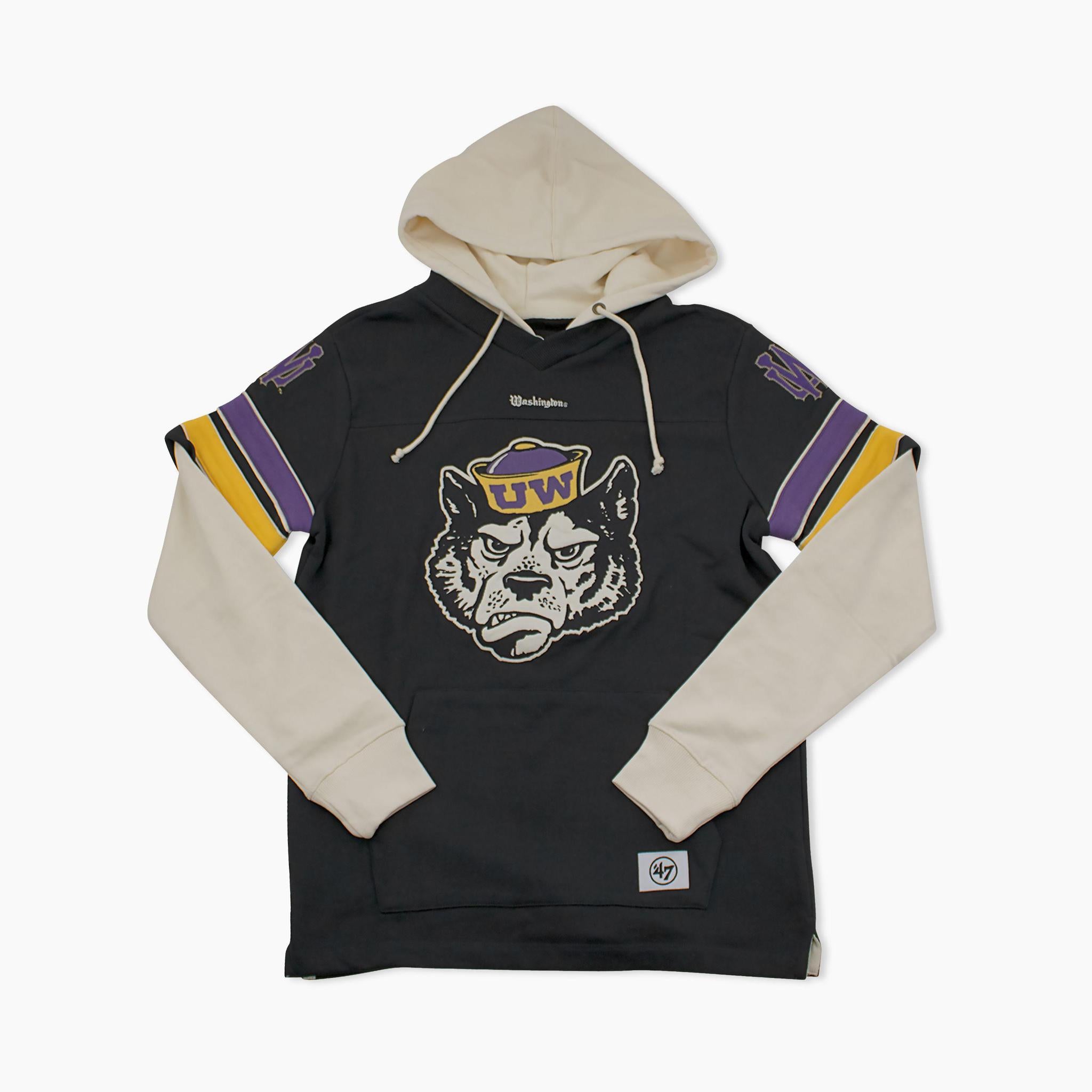 Rep classic UW spirit with the Washington Huskies Sailor Dawg Cornerback Hoodie, featuring the iconic vintage Husky mascot front and center. The two-tone design with cream sleeves and bold purple and gold stripes on the arms adds a true game day feel. Built with a comfortable fit, drawstring hood, and kangaroo pocket, this hoodie is perfect for staying warm at Husky Stadium or around campus. A must-have for fans who want to showcase old-school Washington pride.