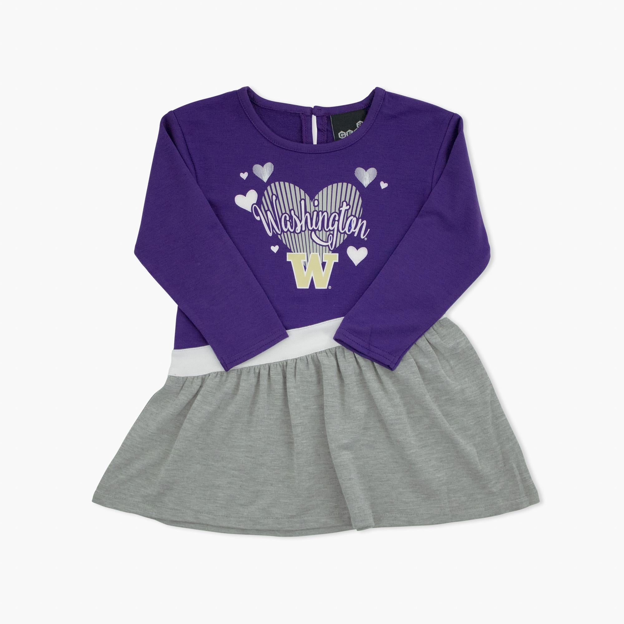 The Washington Huskies Youth Toddler Jersey Tunic is the perfect way for little Dawgs fans to show their school spirit in style. Featuring a purple top with heart graphics and the classic W logo, this tunic blends team pride with a cute, comfortable look. The soft fabric and flowy grey skirt make it ideal for game days, playtime, or everyday wear. Dress your tiny Husky fan in this adorable tunic and cheer on Washington together.