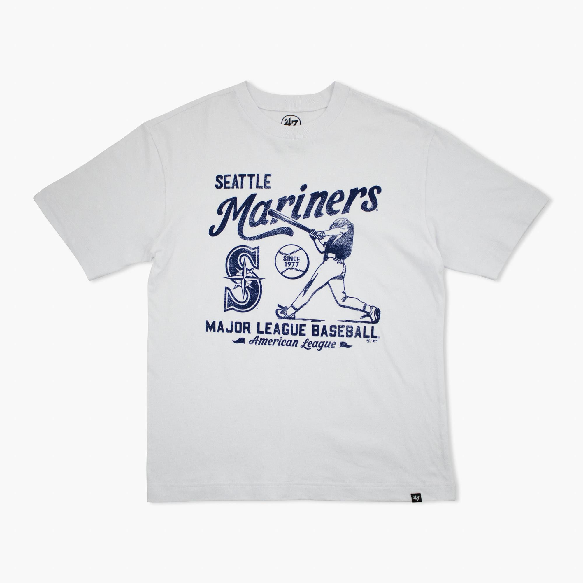 The Seattle Mariners White Regional Foundation T-Shirt delivers timeless baseball style with a vintage twist. Featuring distressed navy graphics of a batter mid-swing and classic Mariners lettering, it celebrates Seattle’s roots in the American League. Made from soft cotton, this tee is perfect for everyday wear or showing M’s pride at the ballpark.