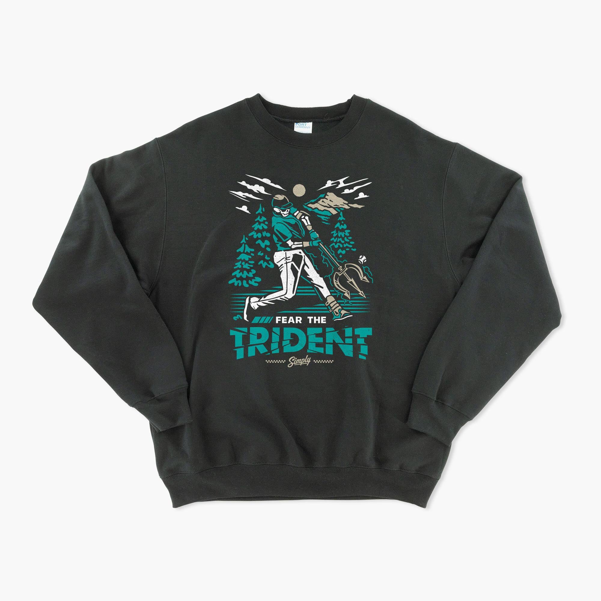 The Fear the Trident Crewneck brings the power of Seattle baseball to your wardrobe. Featuring a bold design of a slugger swinging a trident among Northwest pines, it captures the fierce spirit of the Mariners. Made with soft, midweight fleece, this crewneck is perfect for cool nights at the ballpark or repping the M’s in style.