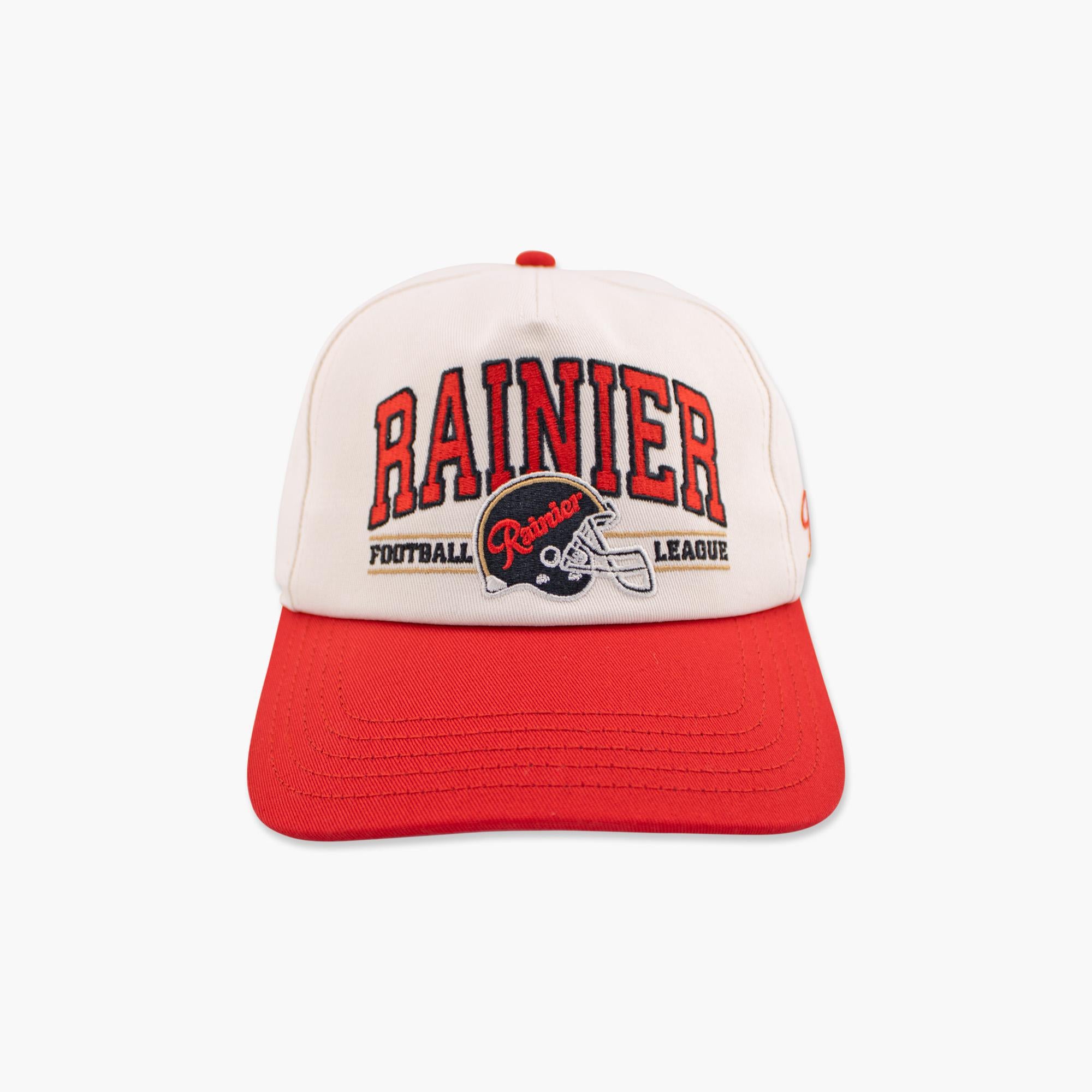The Rainier Beer Roscoe Football Helmet Snapback blends vintage sports style with Northwest heritage. Featuring bold “Rainier Football League” embroidery and a classic helmet graphic, this two-tone cap stands out with its cream crown and bright red brim. Perfect for game days or laid-back weekends, it’s a timeless nod to Seattle’s favorite brew.