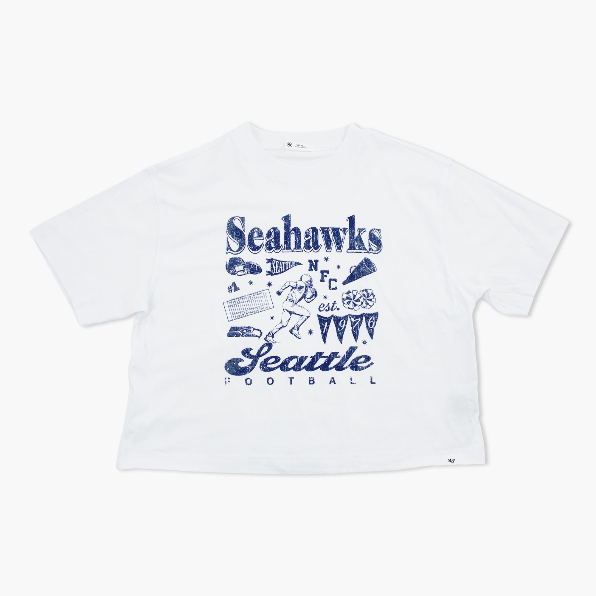 Show your Seahawks pride with this Seattle Seahawks Women’s Vintage Graphic T-Shirt, featuring a retro-inspired collage design and classic team lettering. Highlighting athletic details and football-themed artwork, this tee celebrates Seattle’s rich NFL tradition. Designed with a relaxed fit and soft fabric, it’s perfect for game days, casual outings, or everyday wear. A must-have piece of Seattle Seahawks women’s apparel for fans who love timeless style and team heritage.