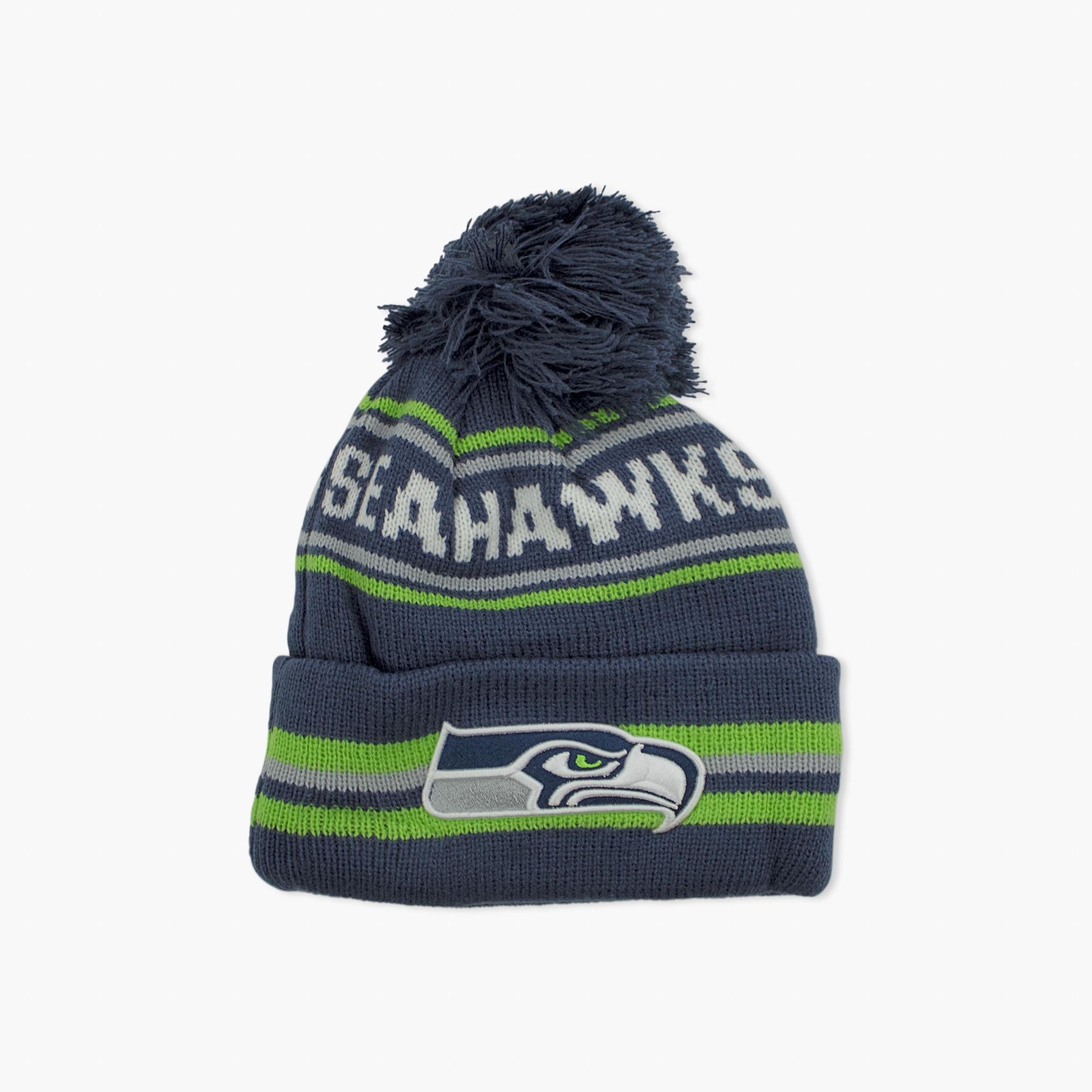 The Seattle Seahawks College Navy Wordmark Cuff Pom Beanie brings classic team style with bold script lettering and traditional navy, action green, and gray striping. The cozy knit construction and fold-over cuff keep you warm while showing off the iconic Seahawks logo front and center. A textured navy pom on top adds a timeless winter touch perfect for game days or everyday wear. A go-to cold-weather essential for any dedicated Seattle fan.