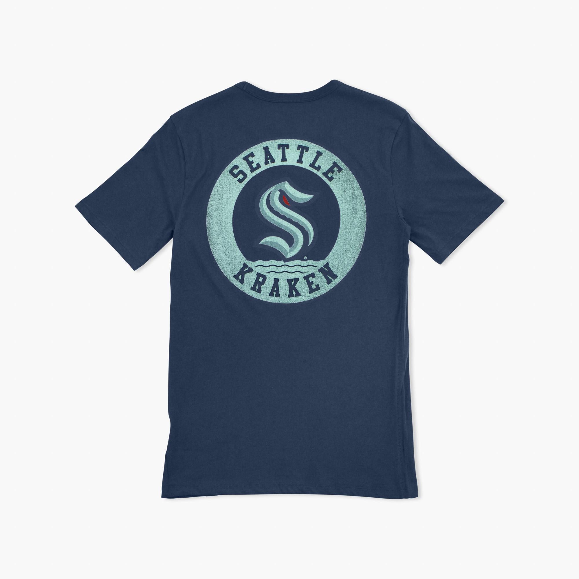 The Seattle Kraken Hold The Line T-Shirt delivers a clean, bold look for every fan of the deep. Featuring the team’s iconic “S” logo on the chest and a large circular Kraken crest on the back, this tee captures Seattle pride from every angle. Made with soft navy cotton, it’s perfect for game days, the rink, or everyday wear.