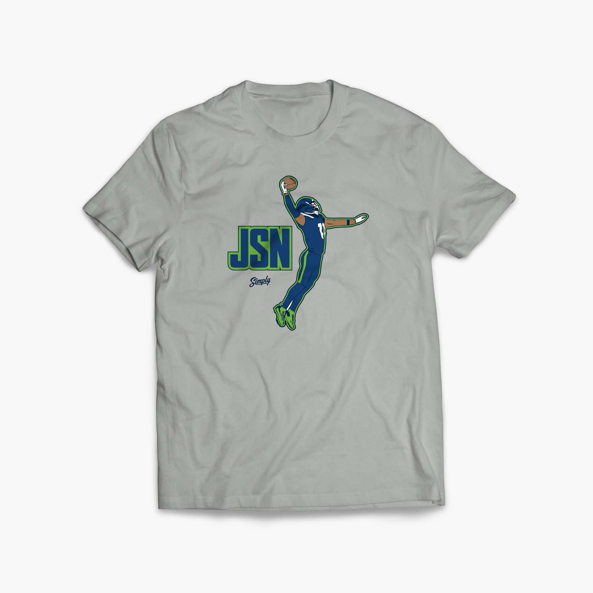 The JSN Dunk T-Shirt celebrates one of Seattle’s rising stars with a high-flying design made for true fans. Featuring an illustrated dunk-style pose and bold JSN lettering, this t-shirt brings energy and personality to your Seahawks-inspired wardrobe. Rep your favorite playmaker in style with this exclusive Simply Seattle original.