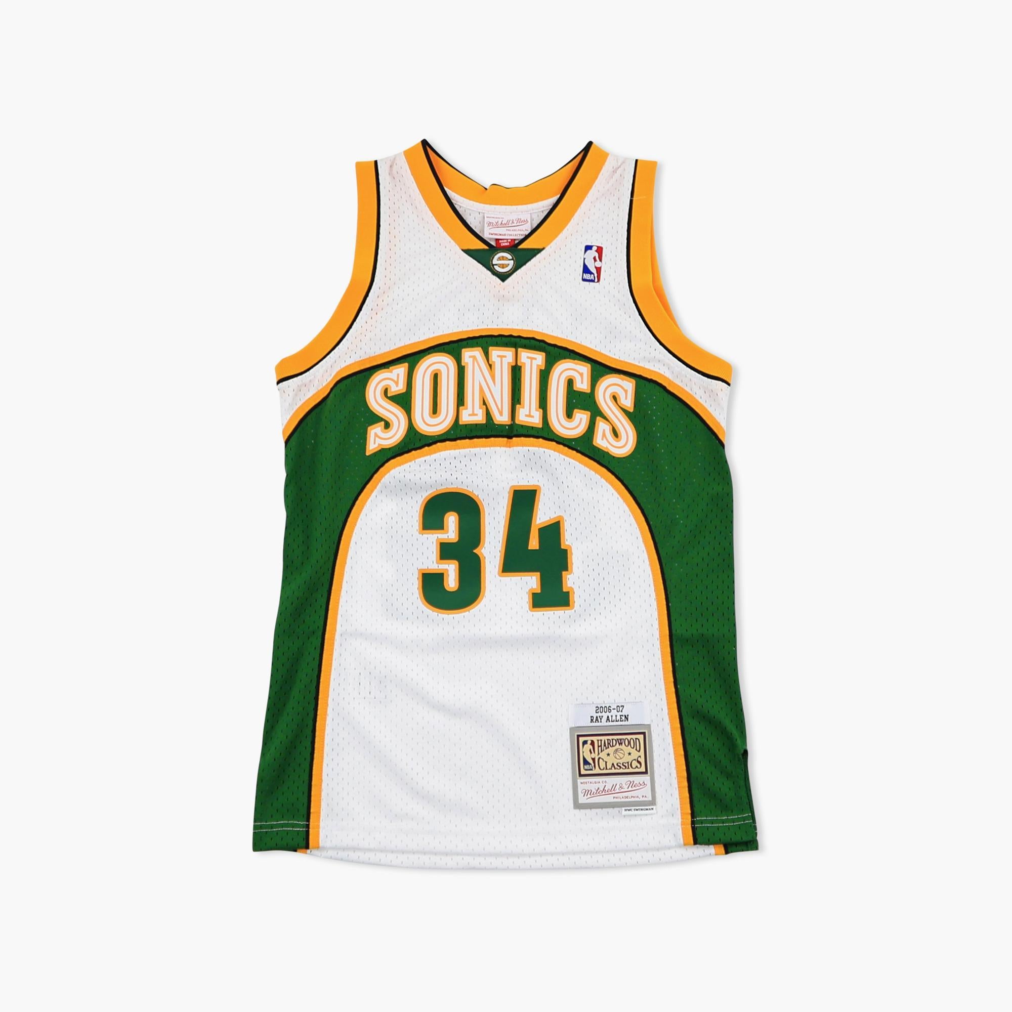 Celebrate the legacy of Ray Allen with the Seattle SuperSonics 2006 Swingman White Jersey. Featuring the classic Sonics green and yellow design, this jersey highlights Allen's iconic #34 in bold stitching. Crafted by Mitchell & Ness, it delivers premium quality and authentic details, including the Hardwood Classics patch. Whether you're honoring a basketball legend or elevating your game-day outfit, this jersey is a must-have for any SuperSonics fan.